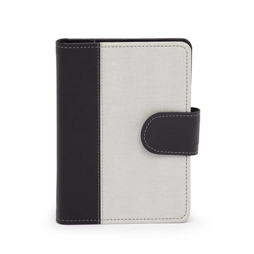 Caderneta de couro sintético com fechamento de botão. Possui caderno capa dura em couro sintético com aproximadamente 100 folhas pautadas, divisórias para cartões e bolso lateral.