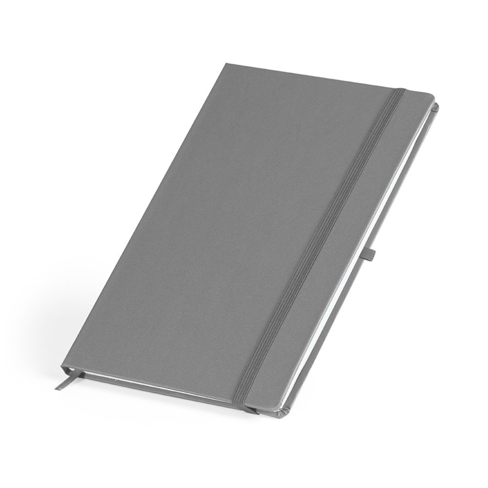 Caderneta em percalux com porta caneta, marcador de página em cetim e fita elástica para fechar. Contém aproximadamente 80 folhas com pauta.
