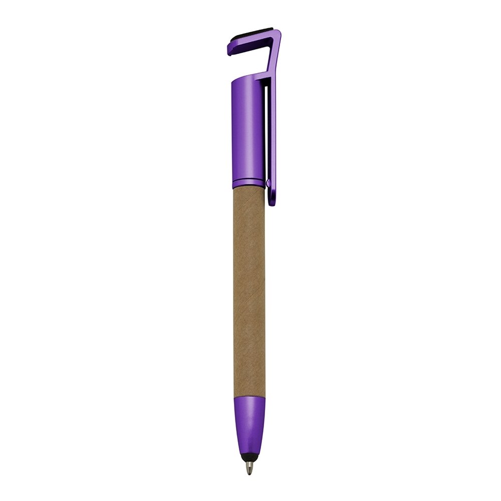 Caneta de papelão com detalhes plásticos, contém suporte para celular, ponteira touch screen e limpador de tela. Carga esferográfica azul 1.0 mm e acionamento por rotação.