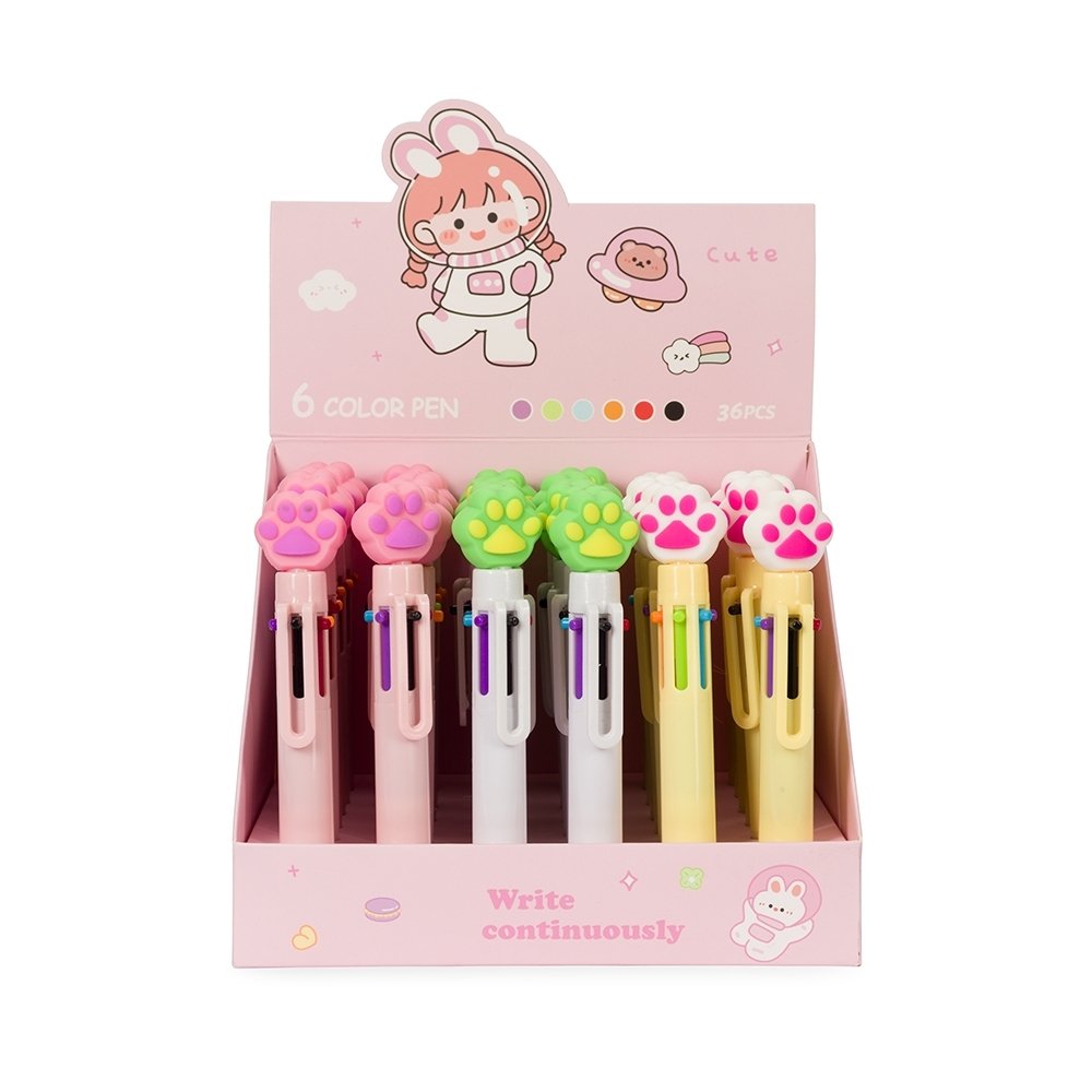 Caneta esferográfica mista com seis cargas coloridas de 1.0mm e acionamento por clique. Sua construção em plástico e enfeite no formato de patas garantem uma escrita suave e precisa com um toque de estilo único.