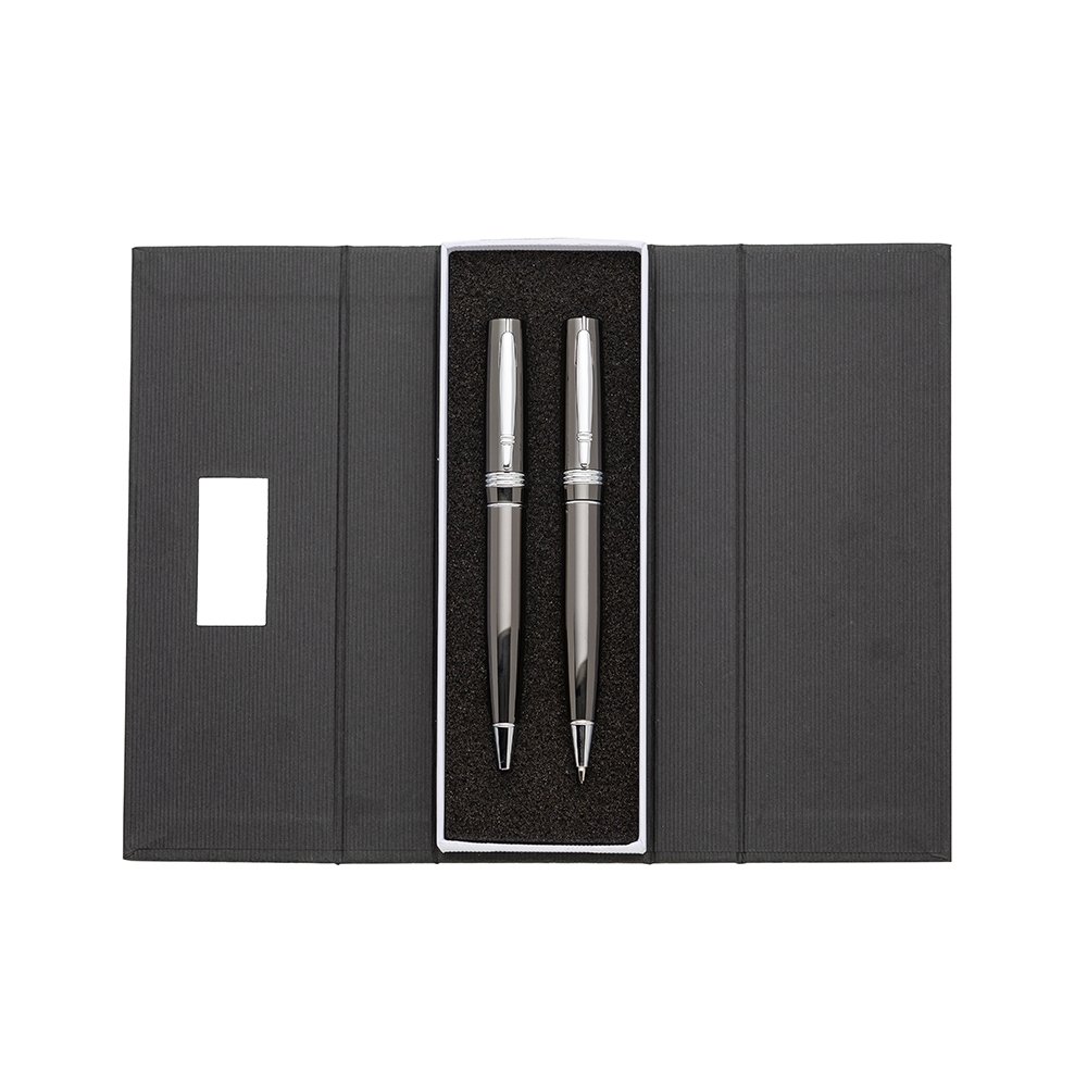 Conjunto caneta e lapiseira em estojo de cartonagem com placa central para personalização. Caneta/Lapiseira metal inteira colorida com detalhes prata, clip metal com duas ?linhas? e na ?ponta? superior detalhe de uma linha no meio. Possui três anéis abaixo do clip, anel centralizado e anel inferior e acionam por giro. Estojo revestida com espuma na parte interna.