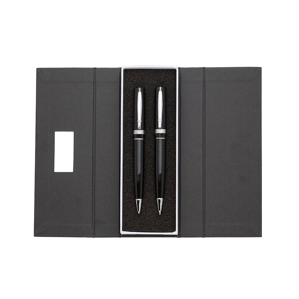 Conjunto caneta e lapiseira em estojo de cartonagem com placa central para personalização. Caneta/Lapiseira metal inteira colorida com detalhes prata, clip metal com duas ?linhas? e na ?ponta? superior detalhe de uma linha no meio. Possui três anéis abaixo do clip, anel centralizado e anel inferior e acionam por giro. Estojo revestida com espuma na parte interna.