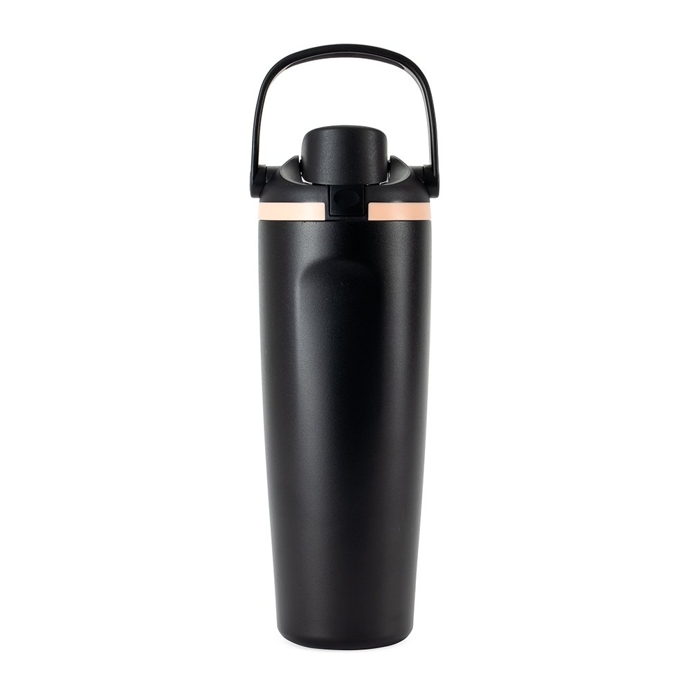 Garrafa térmica em inox com capacidade para até 850ml. Conta com estrutura de parede dupla e vedação a vácuo, ajudando a conservar a temperatura dos líquidos por mais tempo. Possui tampa rosqueável em plástico com protetor para o bocal, botão de acionamento, trava de segurança e alça de mão para transporte. Acompanha canudo para encaixe interno na tampa.