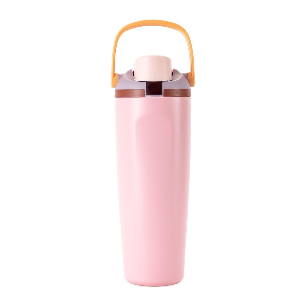 Garrafa térmica em inox com capacidade para até 850ml. Conta com estrutura de parede dupla e vedação a vácuo, ajudando a conservar a temperatura dos líquidos por mais tempo. Possui tampa rosqueável em plástico com protetor para o bocal, botão de acionamento, trava de segurança e alça de mão para transporte. Acompanha canudo para encaixe interno na tampa.