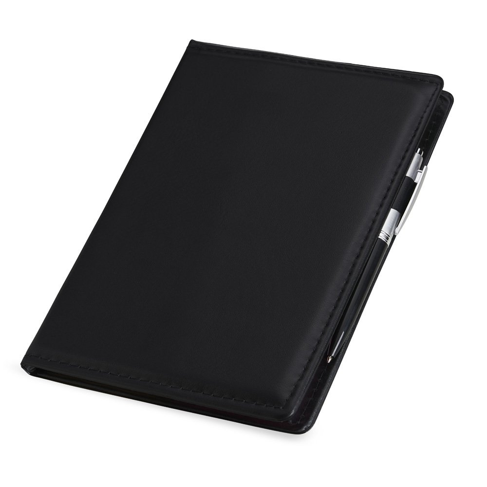 Kit para anotações em couro sintético com autoadesivos e caneta plástica. Contém seis blocos com aproximadamente 50 folhas, conjunto de cinco marcadores plásticos autoadesivos com aproximadamente 26 folhas, bloco A5 com aproximadamente 50 folhas e caneta esferográfica com carga azul e acionamento por clique.