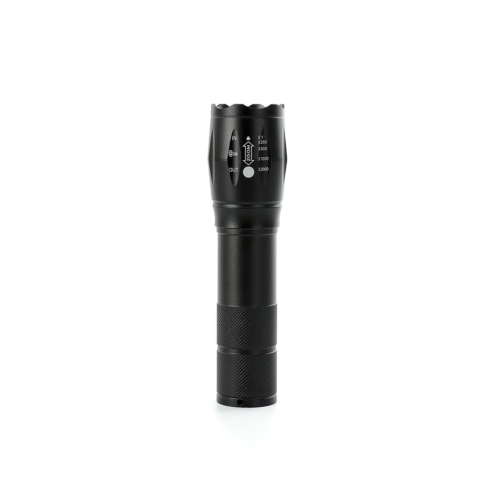 Lanterna led recarregável com zoom de regulagem e três estágios de iluminação, material metálico. Acompanha cordão de nylon e cabo USB-V8.