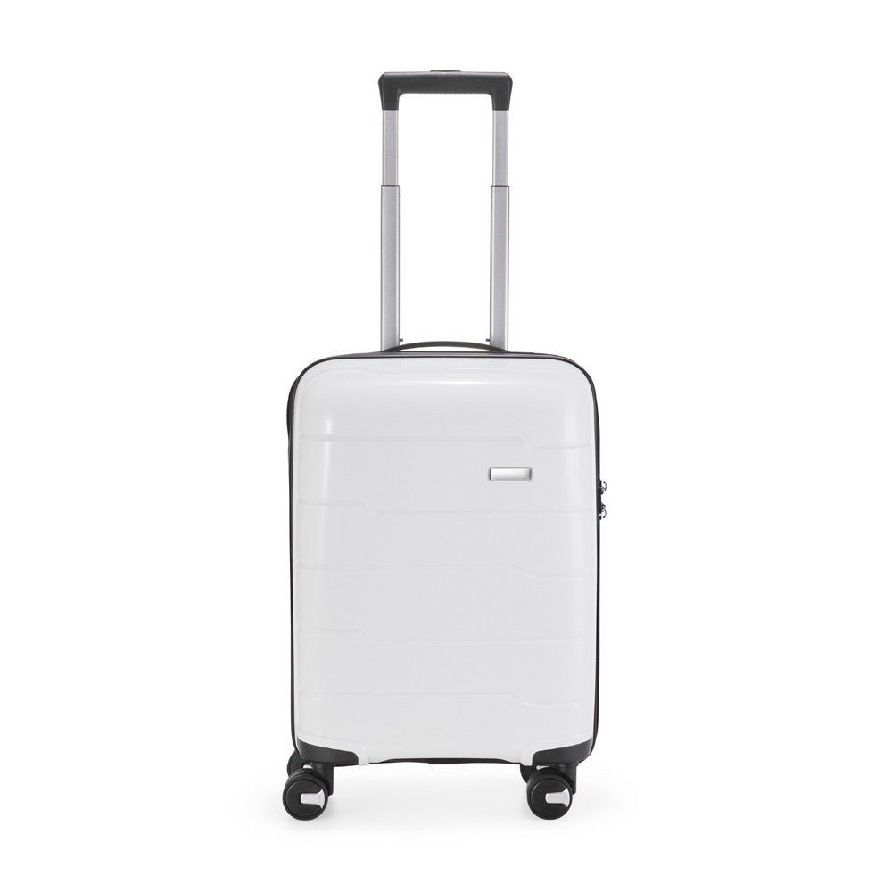 Mala de bordo 40 litros em plástico (casca dura), contém cadeado numérico TSA. Compartimentos com bolso telado e cinta compressora para roupas. A mala possui duas alças de mão, puxador retrátil com regulagem de tamanho, quatro rodinhas 360º e apoios laterais. Acompanha placa para personalização.