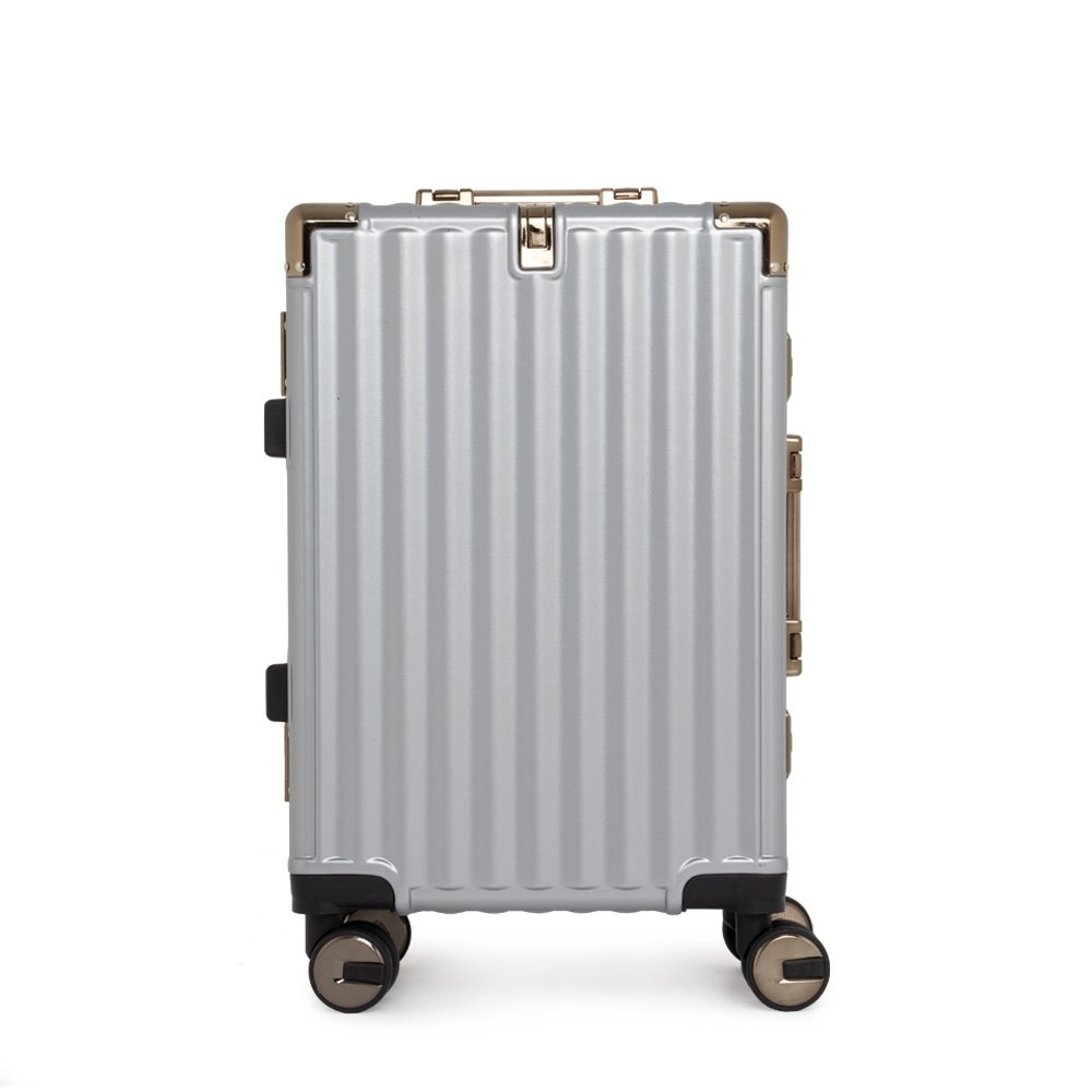 Mala de viagem 38 litros feita em plástico com acabamento em alumínio, contém cadeado numérico TSA. Compartimentos internos com bolso telado, bolso plástico para itens molhados e cinta compressora para roupas. A mala possui duas alças de mãos, puxador retrátil com regulagem de tamanho, suporte porta bolsa, quatro rodinhas 360º e apoios laterais.