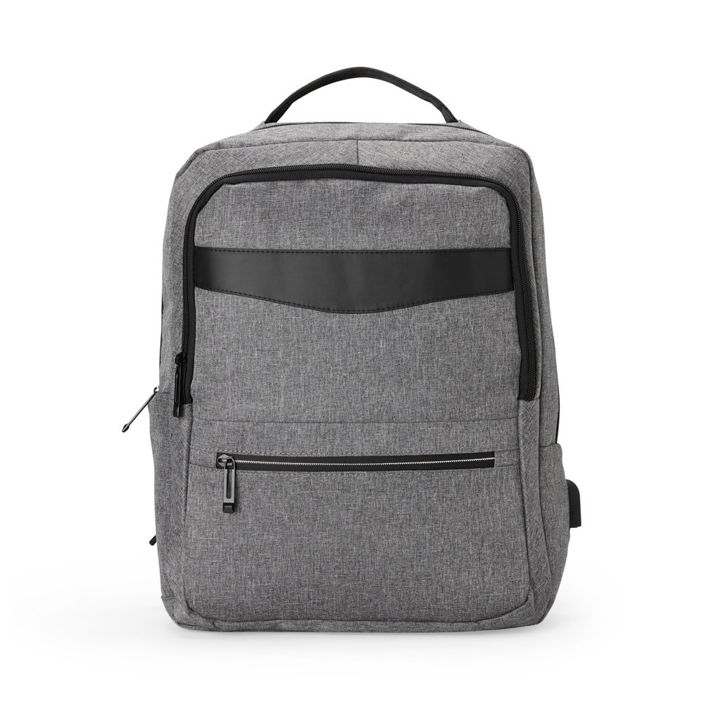 Mochila de nylon 22 Litros com detalhes em couro sintético e três compartimentos, sendo o principal com bolso para notebook 15,6. Mochila possui bolso lateral e suporte externo usb.