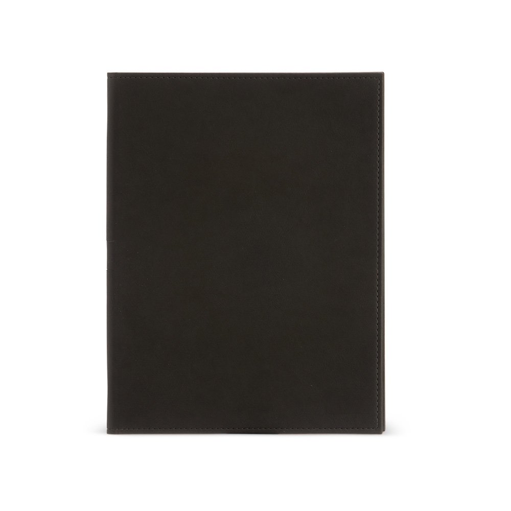 Pasta convenção de couro sintético, possui porta caneta, compartimento para arquivar documentos, dois bolsos para cartões e um bloco com aproximadamente 25 folhas brancas não pautadas.