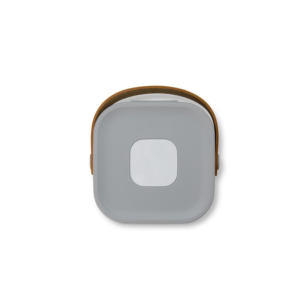 Porta-joias com espelho, produzido em plástico com alça de couro sintético e berço de silicone removível.