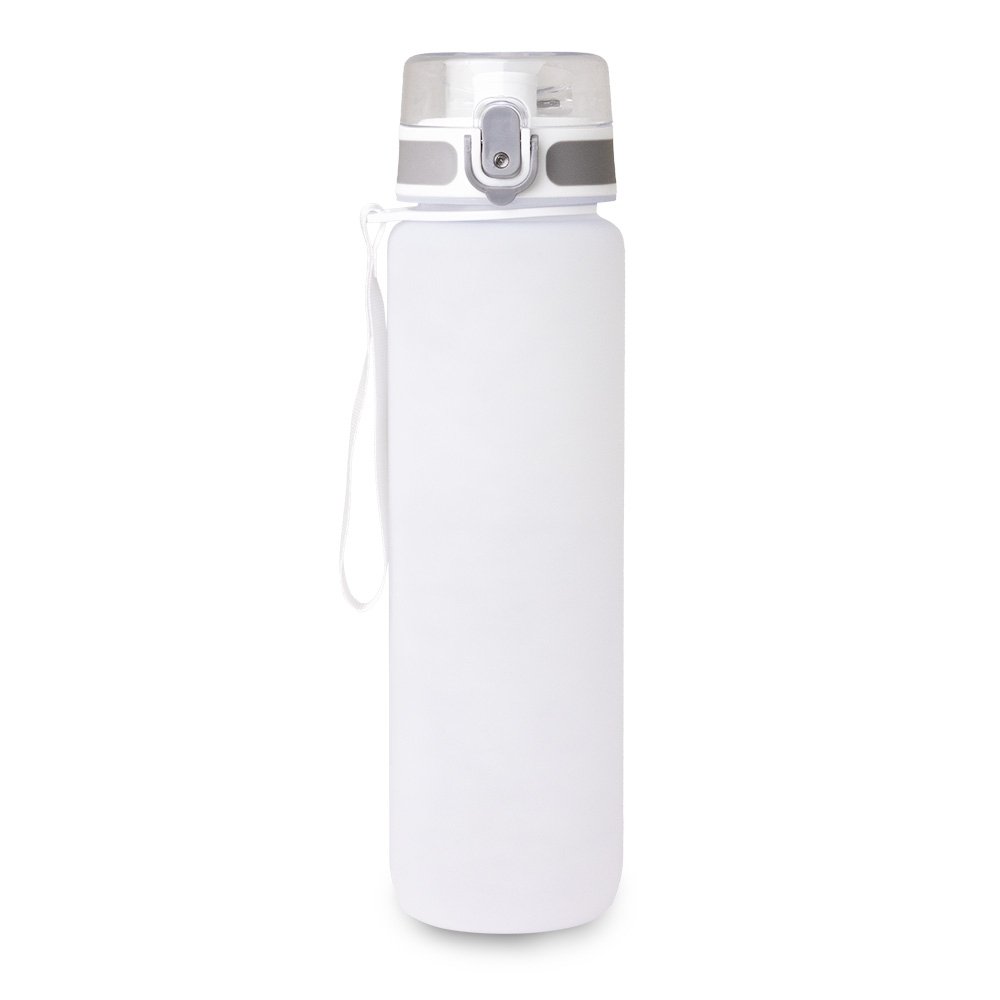 Squeeze plástico com capacidade de 1 Litro, possui tampa rosqueável com botão de acionamento, trava de segurança e alça para transporte.