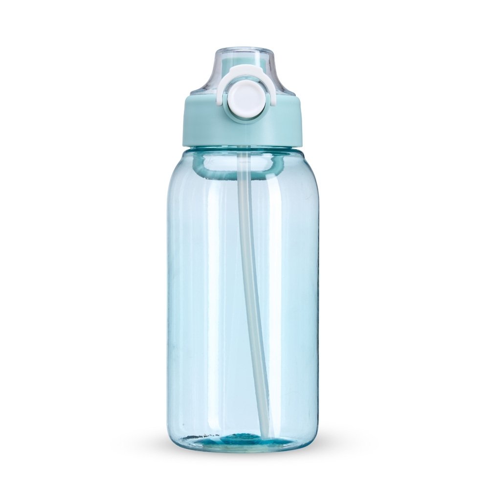 Um squeeze com capacidade de até 1 litro em um formato moderno e funcional. Sua tampa rosqueável contém protetor para o bocal com trava de segurança e acionamento por botão, além de uma alça acoplada para transporte. Acompanha canudo de plástico para encaixe interno.